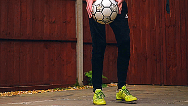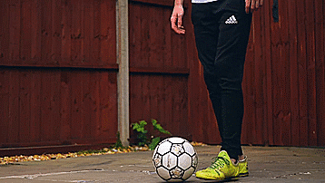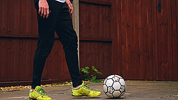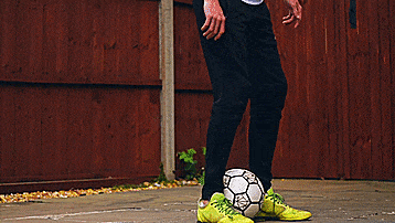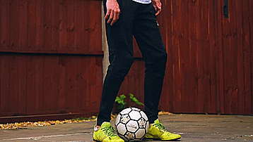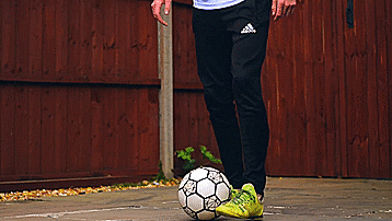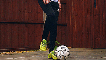 第三步:膝盖弯曲,向后摆动惯用脚,将球磕向弱势脚把球挑起来。