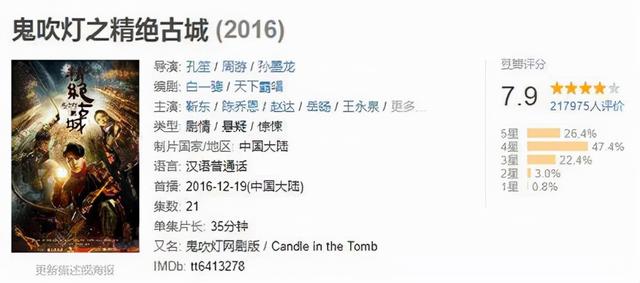 如果说《精绝古城》是鬼吹灯系列的开端,那到了《龙岭迷窟》便是质的飞跃。这一版的评分目前是最高的,从剧情到服化道以及演员表演都是一路叫好。