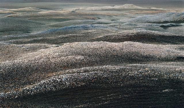 缺水、缺云、缺植被,这里太阳辐射强烈,昼夜温差巨大,地面和山体的岩石都直接暴露在外,于反反复复不均匀的热胀冷缩中逐渐崩解,风一来,就轻而易举地卷走大量碎屑,留下粒度粗的或不易被破坏的组分,它们便构成了戈壁。戈壁的砾石表面常有一层黑亮的“荒漠漆”,主流学说认为这是因为其中水分蒸发,铁锰等矿物形成了深色的氧化物。图/孙志军