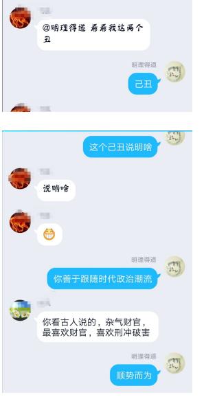 再看己丑到了月柱,除了财富,还能得到啥?顺位相查,妻子壬辰。壬辰甲辰,妻子主动。故问命主:“你的对象初交往是她主动找的你吧?”回答是:“她追的我,我找的她。”这符合命理,是我没有辨析准确,因为己丑伏吟过去,甲辰主动相合,是为女方主动,所以妻子追的她也就符合命理了。