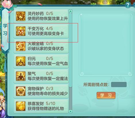 前往临仙镇辅助技能导师(113.103)处学习千变万化技能。使用变身卡可以获得部分能力加成提升战斗力。
