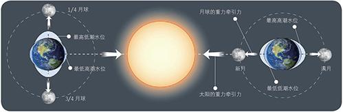 农历每月初一和十五前后,太阳、月亮和地球相对是在一条直线上,太阳和月亮的引力进行了叠加,地球表面的海水会出现明显浪潮。