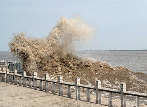 首先,这与钱塘江入海的杭州湾的形状,以及它特殊的地形有关。杭州湾,是喇叭形的,也就是入口大、“肚子”小。钱塘江河道从澉浦以西开始,就急剧变窄、河堤抬高,河床的容量突然缩小。这个过程可以理解为黄河流域,当河水到了河床较高段的时候,就可能出现河沙淤积、河水暴涨的情况。同样,钱塘江的大量潮水拥挤入狭浅的河道,潮头受到阻碍,后面的潮水又急速推进,这就致使潮头陡立,发生破碎、出现轰鸣,出现惊险而壮观的场面。