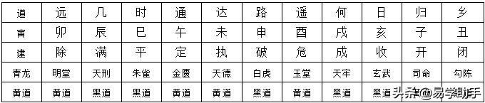 建为青龙用为头,除为明堂黄到游。满为天刑平朱雀,定为金匮吉神求。执为天德值黄道,破为白虎危玉堂。成为天牢坚固守,收为玄武盗贼愁。开临司命为黄道,勾陈为闭主亡流。黄道出行为大吉,行军斗阵黑道忧。