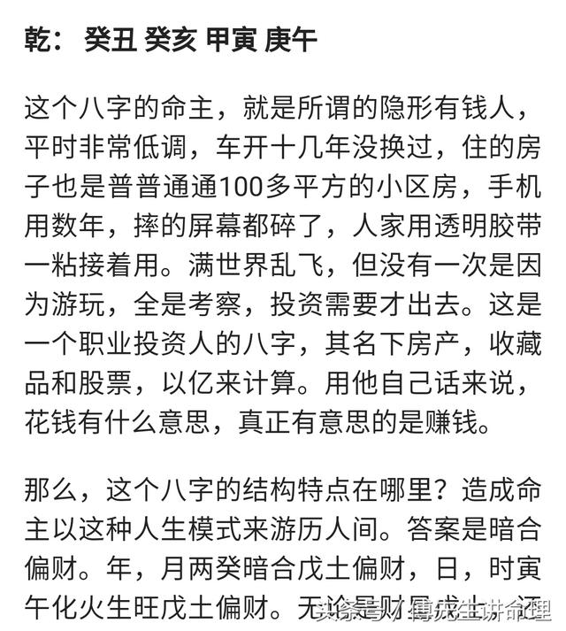 原文章的作者以为这个案例有钱是因为暗合偏财的原因,很显然作者本人不懂古法,不知道这种格局叫时上一位贵。