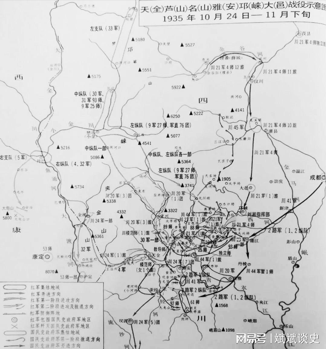 好了,左右纵队的进展讲完,相信大家已经知道了杨国帧的处境了,现在杨国帧的局势已经非常明了了,东面的援军被我军左路纵队已经全部吃掉,增援这种事已经成为天方夜谭,最后的救命稻草郭勋祺的模范师也已经逃走,现在的杨国帧也只剩自己在芦山苟延残喘。此时许世友派第四军一部朝芦山城方向前进,配合中路纵队进攻芦山城,杨国帧见大势已去又发扬军阀的“优良传统”之一,连夜逃跑了。到这里,红四方面军已经拿下天全和芦山。这两支川军在这一带的精神支柱全都纷纷逃跑,此时川军的其他各部见精锐王牌纷纷逃走,军心动摇,也无心再战,这导致各处敌军战斗力极为薄弱,开始消极抵抗,许多地区基本都是一触即溃,随后我军迅速拿下名山,总体来讲前期战事红四方面军非常顺利,至此我军已占领大部分地区,与百丈关对峙。但我想说的是,大家不要觉得进展顺利是因为地方军阀非常弱,这虽然是其中一部分原因,其实最大的原因就是我军指战员的战略战术和坚强的意志,以及英勇无畏的将士们,正因为我军的战术打的敌人非常慌乱,才使得这些敌军看似脆弱不堪,一触即溃,如果一直都是阵地战、攻坚战那还真要费些力气,这也是南下后期所遇到的困难。好了,我们继续回到战事。